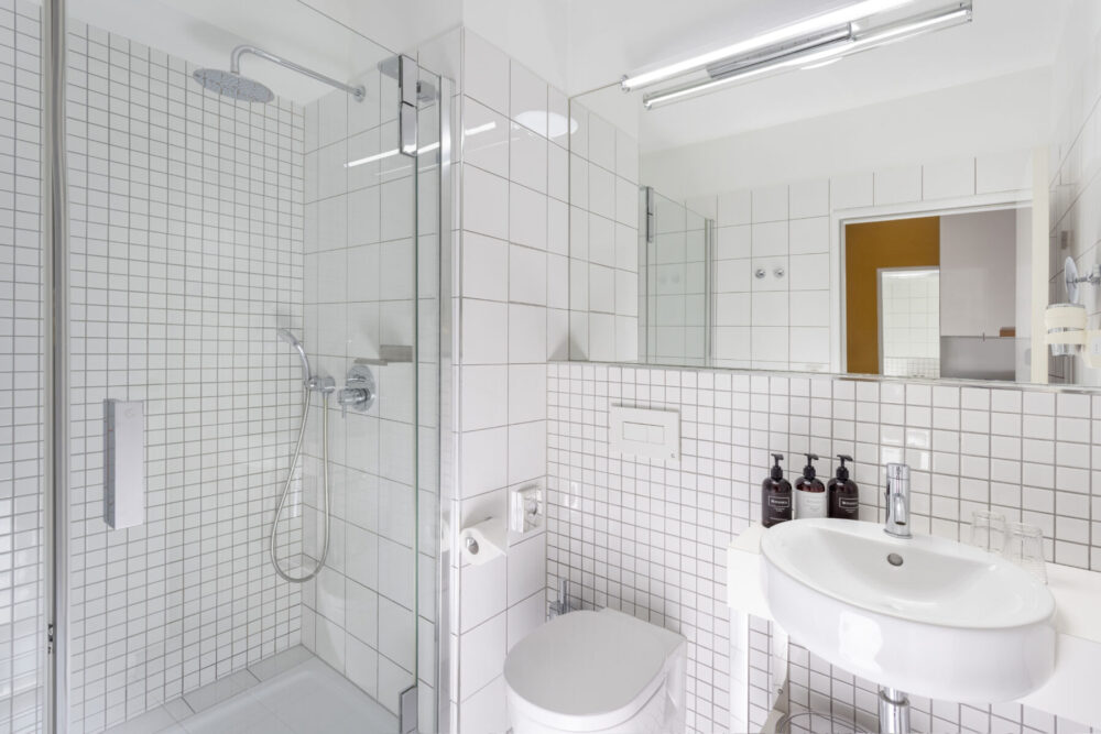 Shower/bathtub, toiletries, hairdryer, high-quality towels, and large bath sheets (600 g/m²).